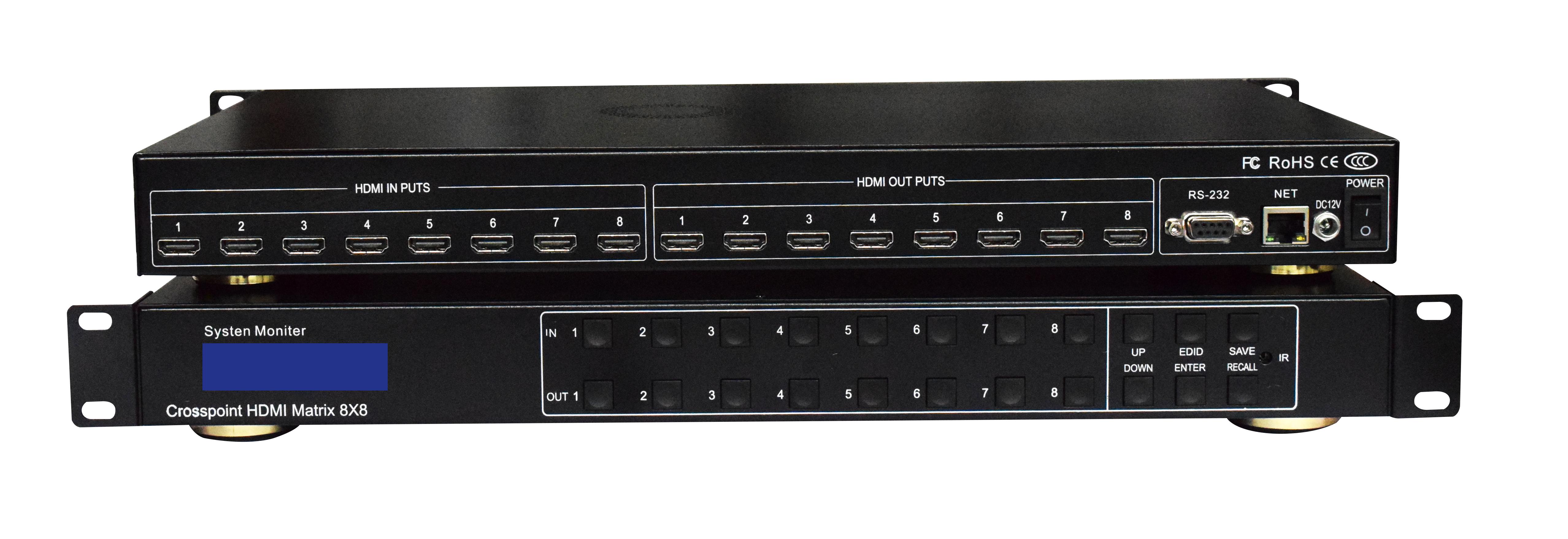 HDMI8x8矩阵(带EDID控制)可连接8路HDMI信号源到8个显示设备。主机有8路HDMI输出,且每一路HDMI输出都支持1080p到4K的全高清格式,以及所有的3D格式。支持独立的EDID控制。HDMI8x8主机可连接到HDMI显示器的蓝光DVD、数字机顶盒、笔记本电脑搭配使用。通过提供的IR遥控装置、RS-232和TCP/IP,或者通过前面板的选择按键来选择,切换显示。