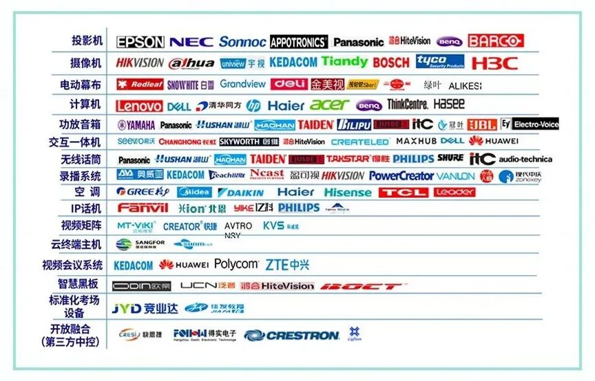 智校平台支持自定义控制设备接口,拥有同类平台难以企及的兼容性,既能接管第三方设备及平台,还能实现数据的互通有无。其兼容性在市场表现上尤为亮眼,已兼容产品共15大类、102个品牌、1020余种设备。