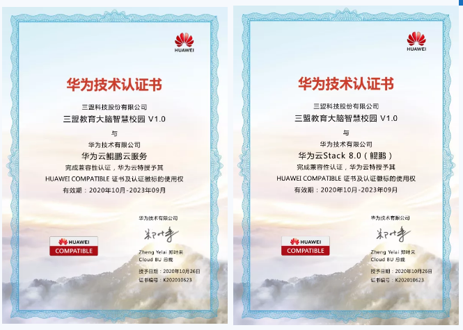 在兼容性方面,三盟科技教育大脑智慧校园解决方案的表现更是出色,顺利完成华为云鲲鹏云服务、华为云Stack 8.0(鲲鹏)的兼容性测试,获得华为云鲲鹏云服务和华为云Stack8.0的双兼容性认证。