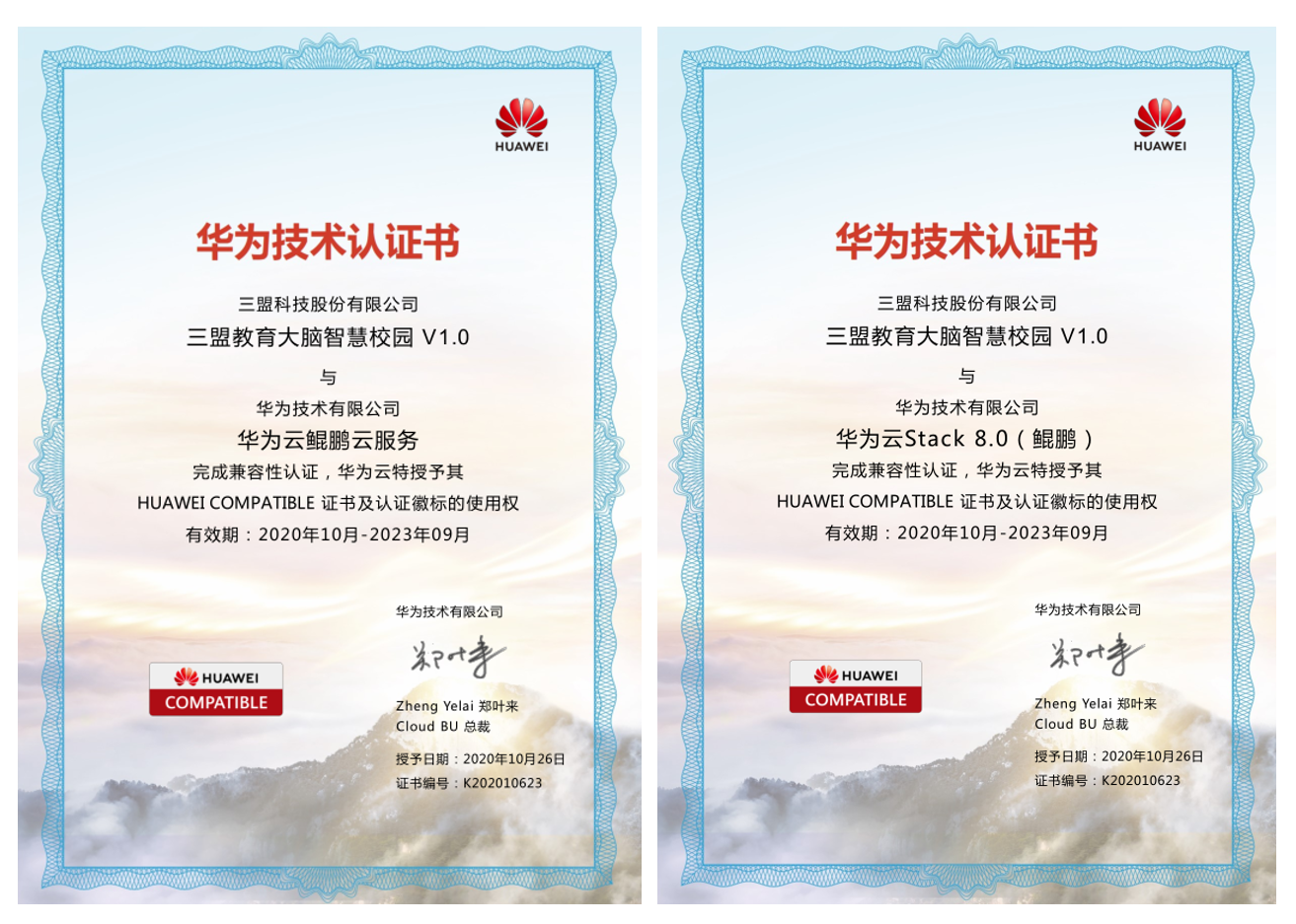 同时,教育大脑智慧校园联合解决方案还获得华为云鲲鹏云服务和华为云Stack8.0的双兼容性认证。标志着三盟科技“教育大脑”与鲲鹏国产化环境的强兼容能力,验证了方案在云服务场景上优越的灵活性,适用于公有云、私有云、混合云下的X86及ARM架构,有利于帮助学校实现业务创新更灵活、数据流转更安全、运维更轻松。