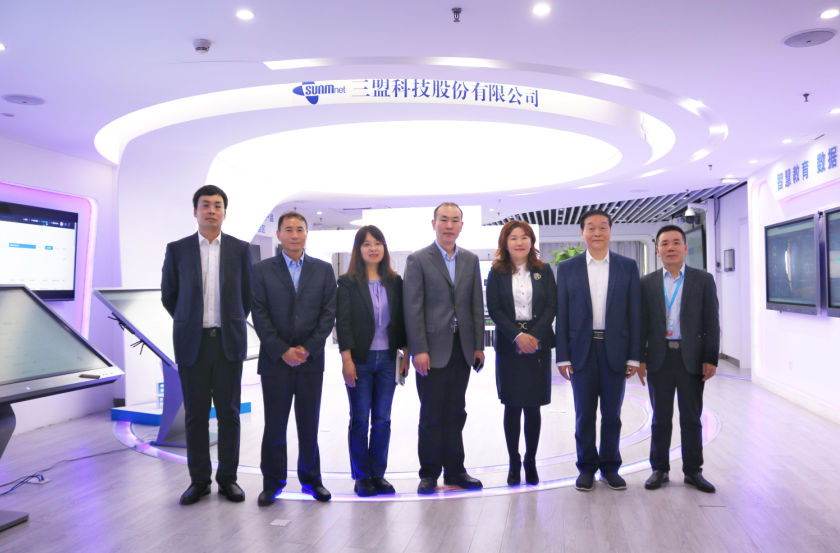 三盟科技董事长王喜英、战略发展顾问郭玉琨、副总裁安志峰、法务总监王国彬等陪同参观。期间,王喜英向考察团就公司发展、团队情况、技术实力、应用案例等方面作介绍。张红军主任认真听取汇报,并对三盟科技在教育信息化领域取得的成绩给予充分认可。