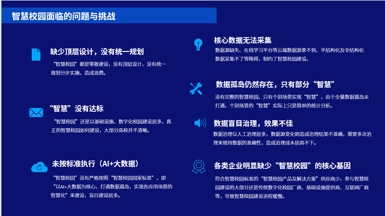 魏广平博士表示,近年来我国的教育信息化建设水平已有很大进步,但高校的智慧校园建设仍存在缺乏顶层设计、“智慧”未达标、数据孤岛未打通、核心数据缺失、数据治理质量低、建设进程缓慢等问题。