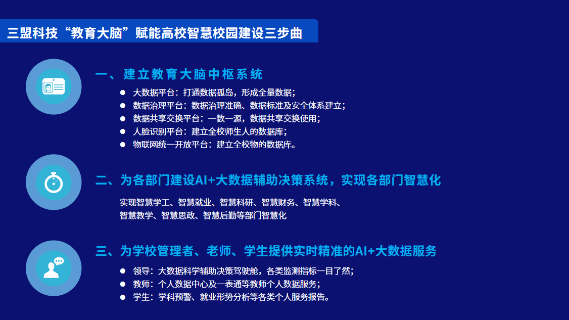 面对高校智慧校园建设中存在的问题,魏广平博士提出智慧校园建设需要做好顶层规划,为学校教育信息化的长足发展做好布局,借助三盟科技“教育大脑”,“三步曲”赋能智慧校园建设。