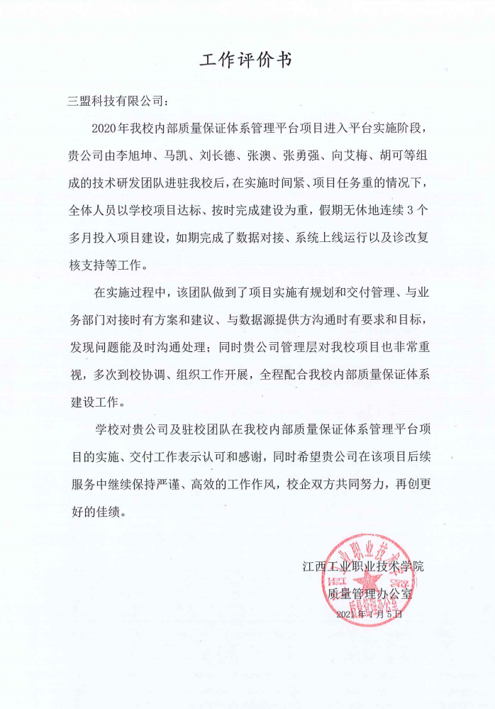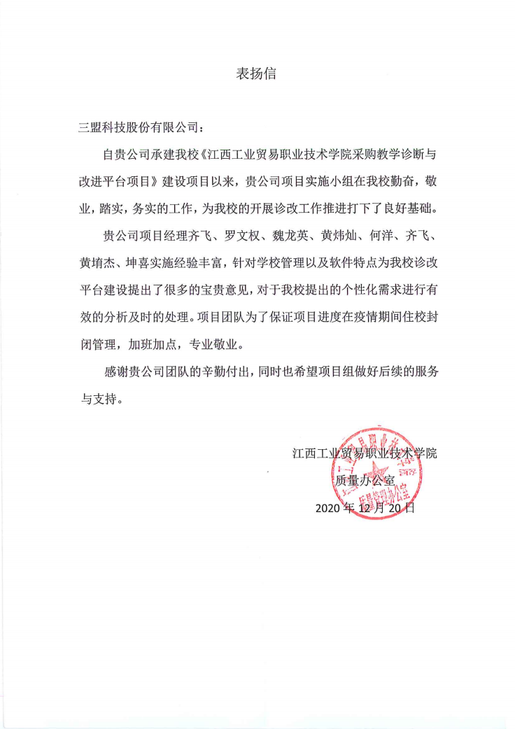 默默耕耘,终有所成。2021年,我们不断创新技术、迭代服务,为高职院校的教学诊改工作提供强劲的技术支撑。短短数月,我们接连收到了来自江西工业贸易职业技术学院、江西工业职业技术学院、江西制造职业技术学院发来的表扬信。