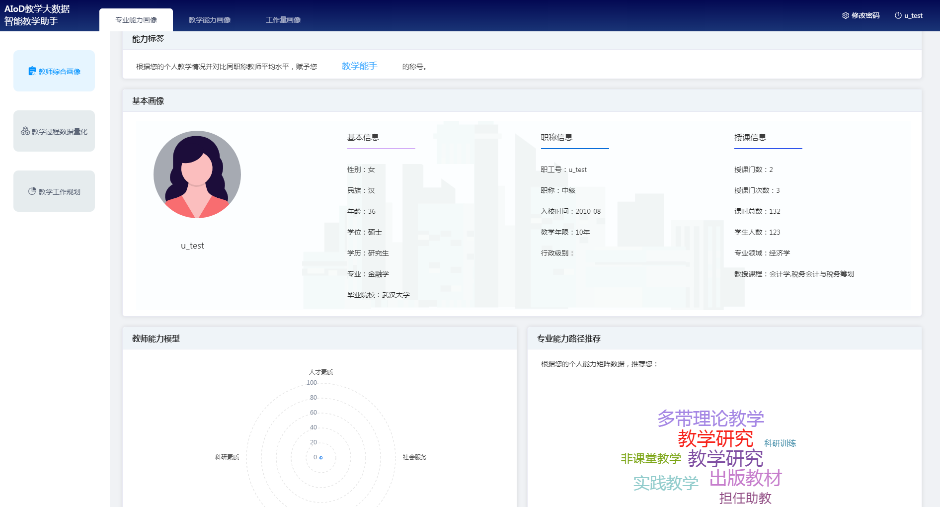 平台通过综合分析教师教学过程、教学内容、教学行为、教学成果、教学评价等数据,构建教师综合画像,并根据教师的个人能力矩阵,推荐专业能力发展路径,促进教师自我能力提升。