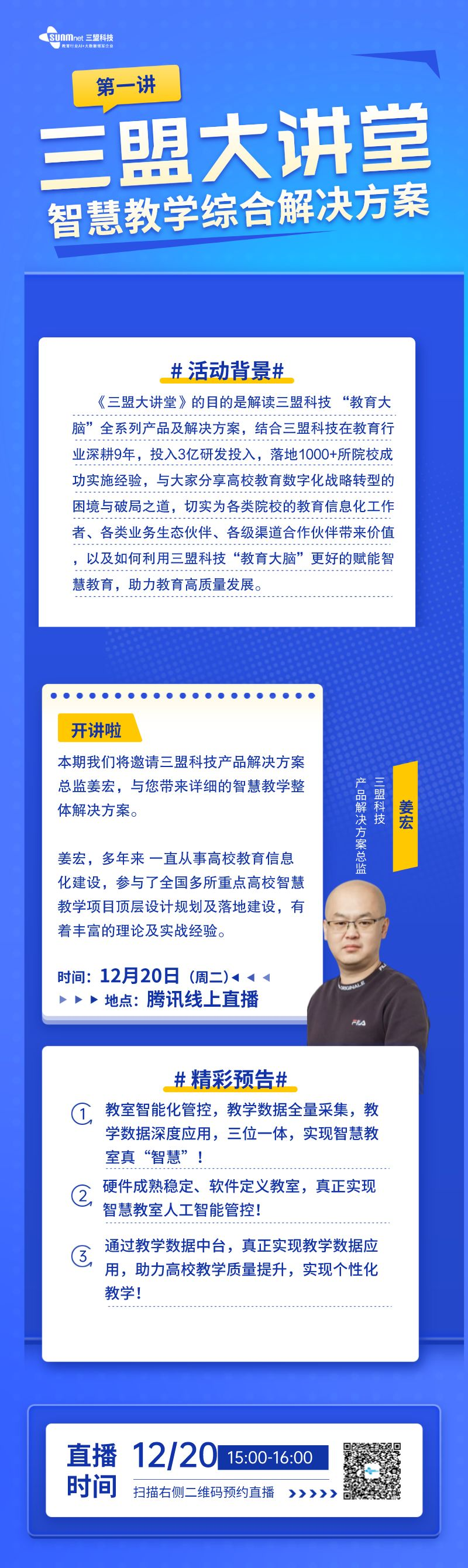 三盟科技倾情打造《三盟大讲堂》,助力各类院校与各类合作伙伴在教育数字化转型的目标、方法、实施等方面达成共识,并给予实战技巧。首期节目特邀三盟科技产品解决方案总监姜宏线上开讲,欢迎各类院校老师、合作伙伴朋友们走进直播间共同学习,为教育数字化战略转型助力。