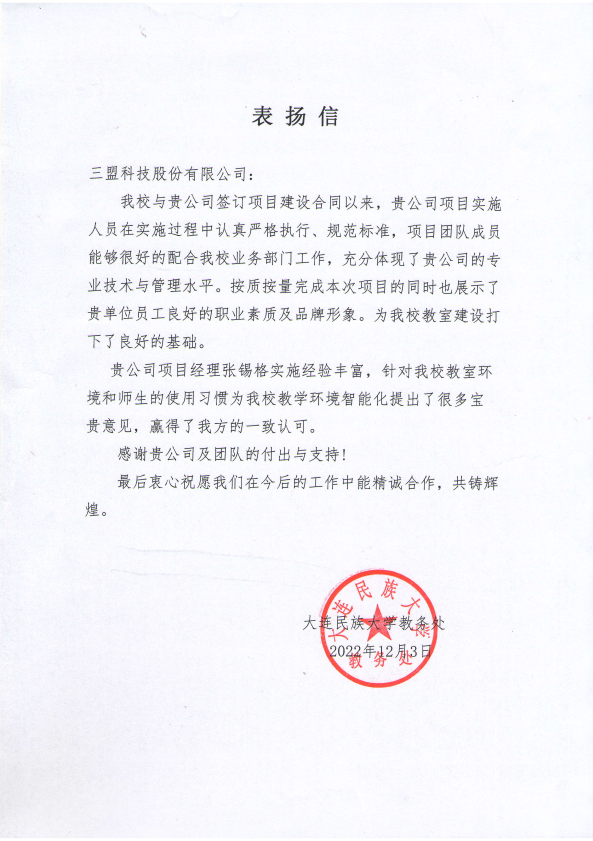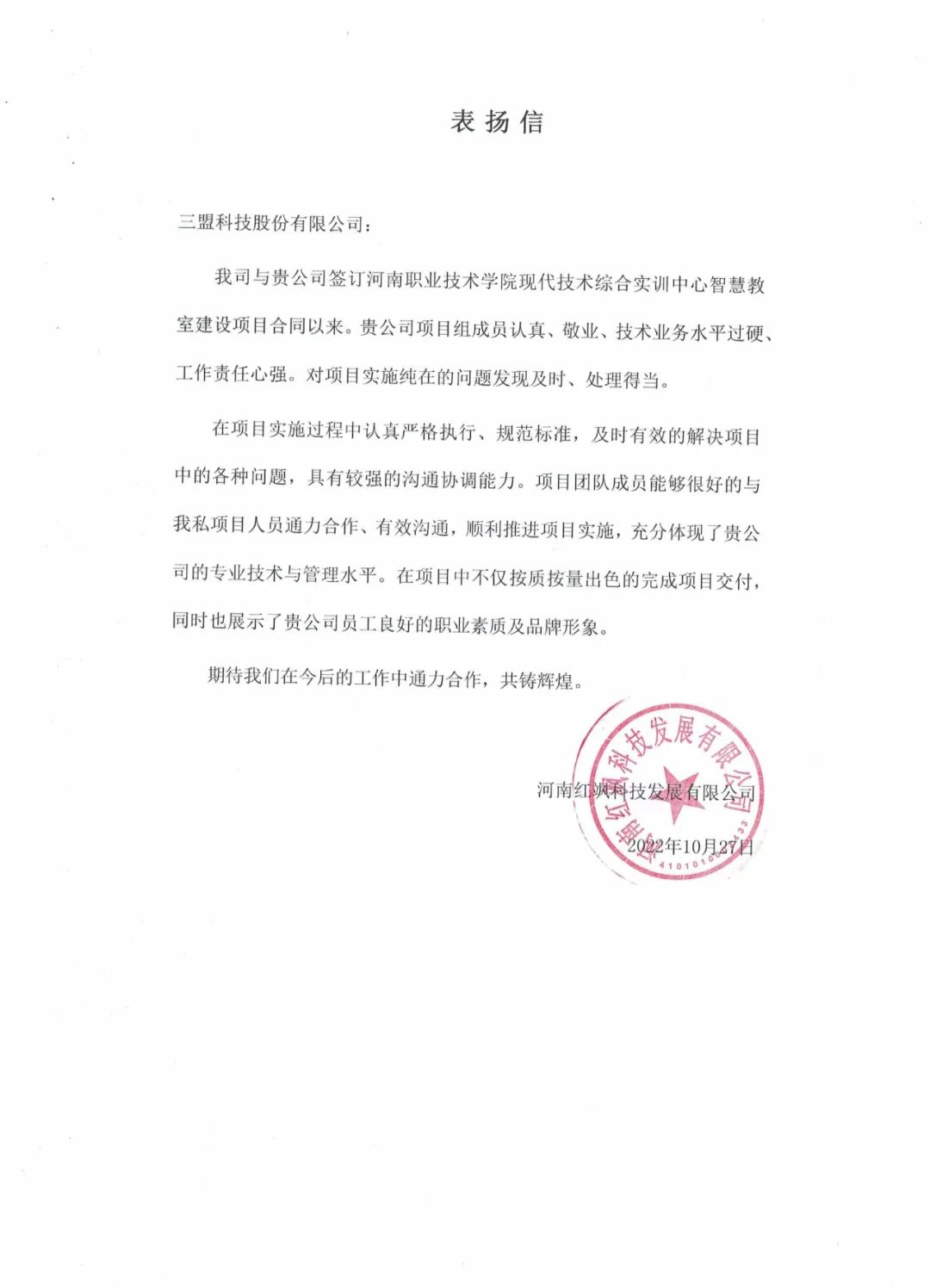 2022年8月,三盟科技与河南红飒科技发展有限公司就河南职业技术学院现代技术综合实训中心智慧教室建设项目签订合作合同,期间三盟科技项目实施团队,凭借认真、敬业、技术水平过硬、工作责任心强,对项目实施过程中存在的问题发现及时、处理得当,获得校方和合作伙伴同事的高度认可。