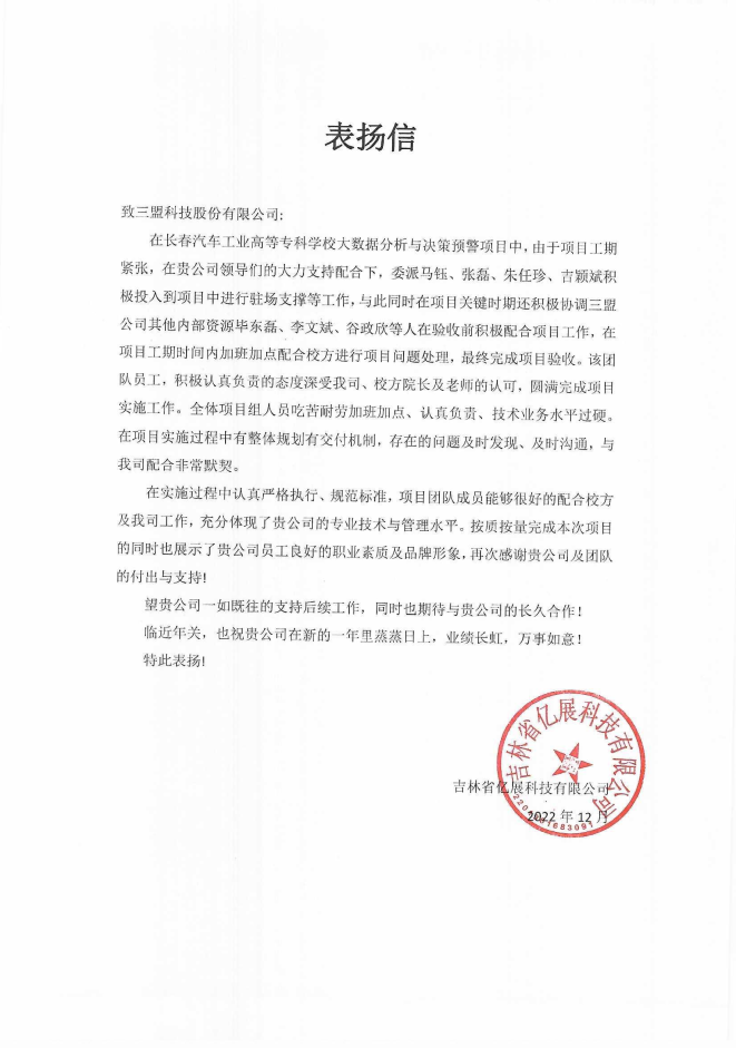 收到这些表扬信,三盟科技倍感荣幸,衷心感谢各类院校和合作伙伴的支持与信任!同时,我们也为团队里每一个默默付出的三盟人而自豪,更为他们力争做好客户服务的决心与坚持所打动。