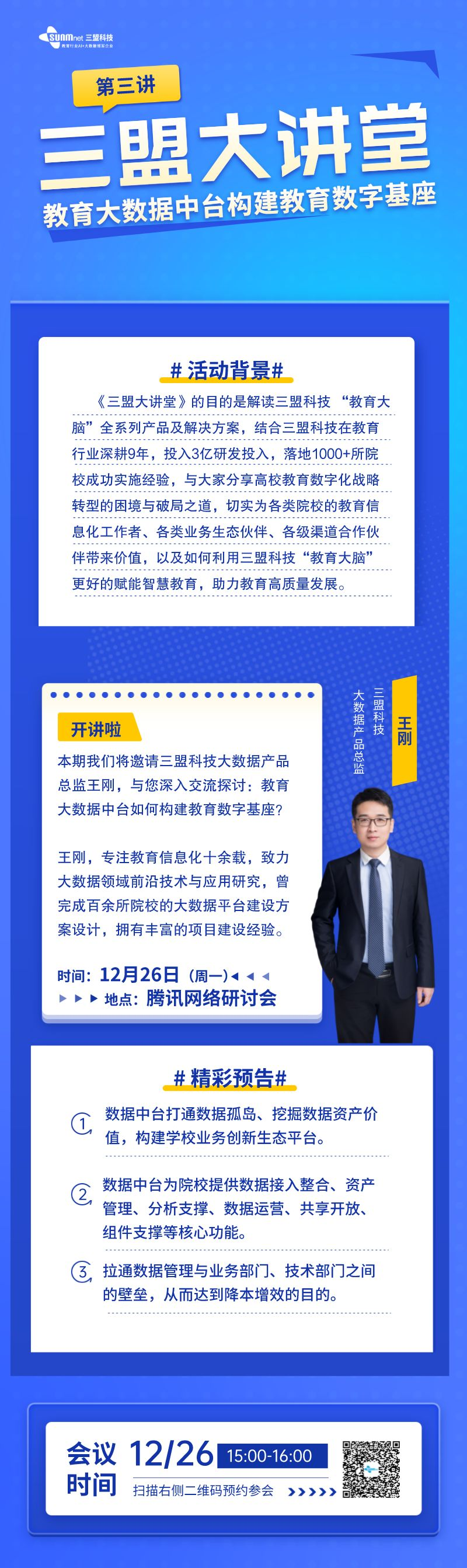 三盟科技倾情打造《三盟大讲堂》,助力各类院校与各类合作伙伴在教育数字化转型的目标、方法、实施等方面达成共识,并给予实战技巧。第三讲节目将围绕“大数据中台产品”面向合作伙伴进行专场分享,并特邀三盟科技大数据产品总监王刚线上开讲,欢迎各类合作伙伴朋友们走进研讨会共同学习,为教育数字化战略转型助力。