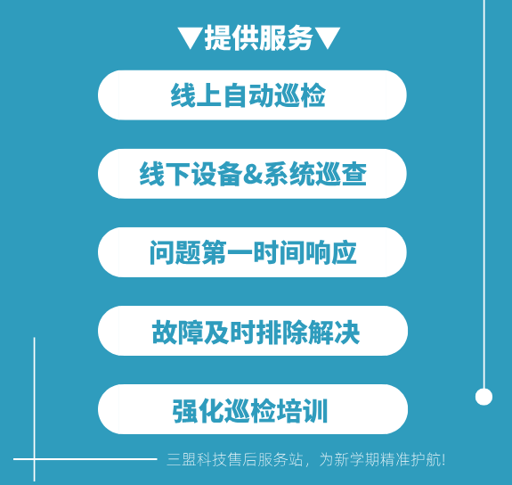 疫情全面放开后的第一个新学期,相较于以往来的更早一些,为支撑各大高校开学工作的开展,全力保障学校管理信息化、教育教学信息化正常运行,三盟科技成立售后服务专项组,启动“春季校园专项巡检行动”,针对我司交付的项目变“被动故障”为“主动排除”,在巡检行动中早发现、早报告、早处置,防患于未然,消除开学季后顾之忧。