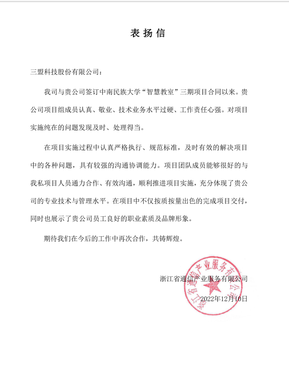 三盟科技与浙江省通信产业服务有限公司就中南民族大学“智慧教室”三期项目签订合作,期间三盟科技项目实施团队,精诚团结、科学组织,凭借认真、敬业、技术水平过硬、工作责任心强,对项目实施过程中存在的问题发现及时、处理得当,获得校方和合作伙伴同事的高度认可,高品质完成既定目标。