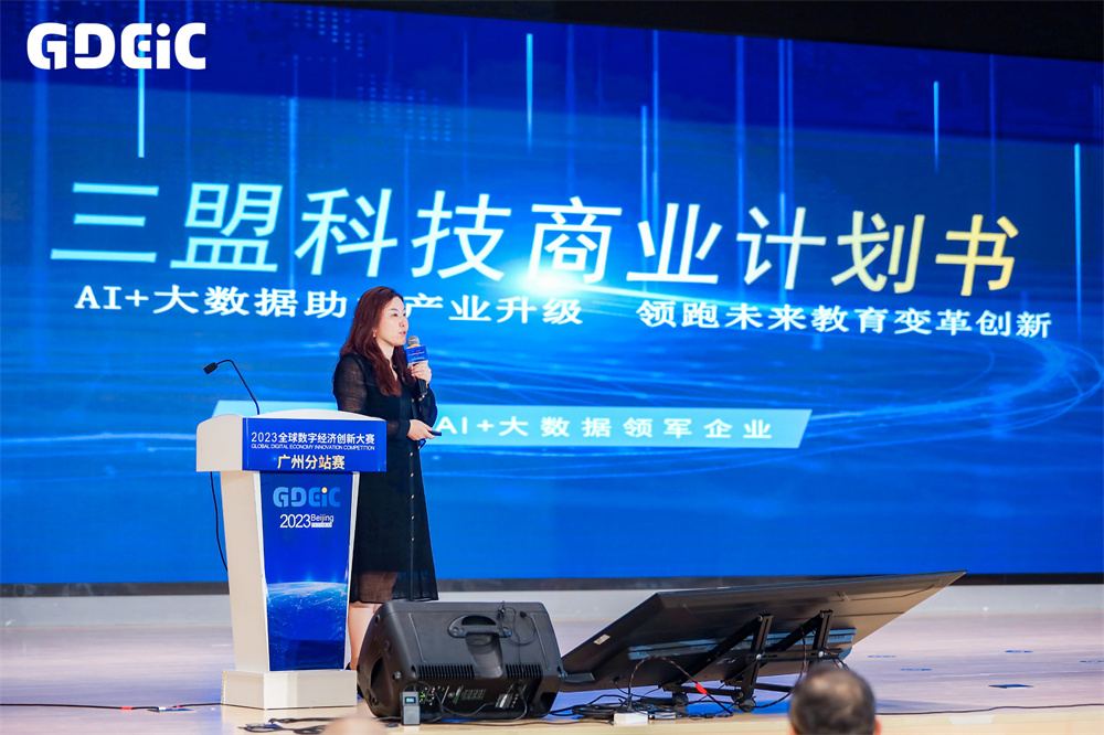 广州赛上,10大高质量创业项目激烈角逐,由三盟科技董事长王喜英女士带来的《教育数字化底座及AI应用引领者》项目,围绕核心技术、商业模式、市场前景、团队构成、财务情况和发展规划等方面进行全方位展示,凸显了强劲的发展力、竞争力。