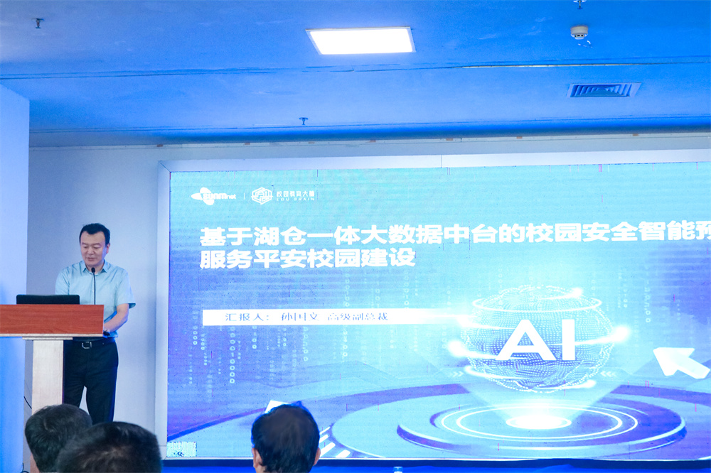 会上,三盟科技高级副总裁孙国文带来《基于湖仓一体大数据中台的校园安全智能预警预测平台 服务平安校园建设》的主题报告。