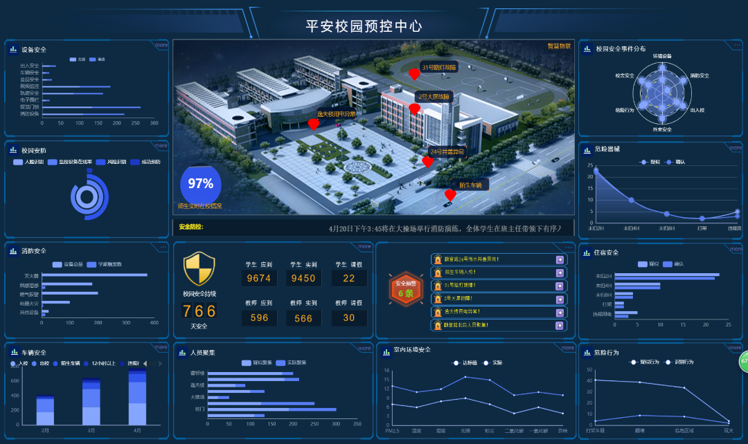 平台通过利用大数据的科学分析与人工智能的预警能力,将校园安防设备及各业务系统的数据全面打通,网罗全校数据,全方位感知校园安全动态。同时做到对校内人、事、物的实时监测与异常预警。诸如消防栓移位、烟雾识别、消防通道被占用、学生群体斗殴、持械等异常行为,都能通过平台提前预测预警。并借由AI之手上报给决策者、管理人员,以便学校前置采取防范应对措施。依托平台构建的高效、严密、智能的校园安全防控机制,帮助学校变革传统经验式管理模式,迎来以数据驱动的校园安全管理新格局。