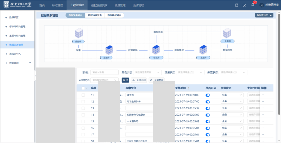 广财数据治理的首要举措,就是建设数据治理共享交换平台,实现对多源数据的采集。平台采集了人事系统、科研系统、教务系统、学工系统、研究生管理系统、财务系统、后勤系统等13个业务系统的结构化数据。