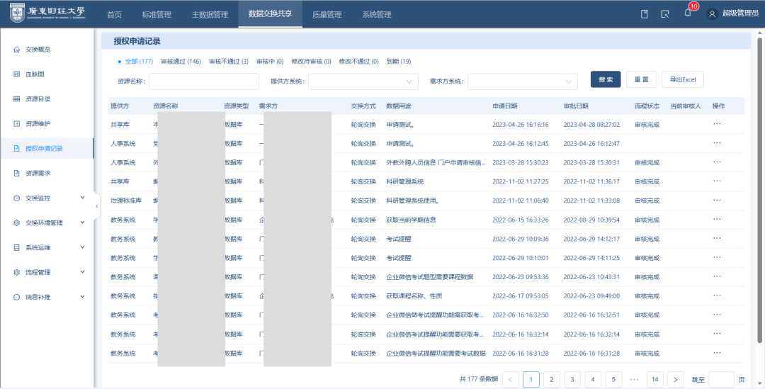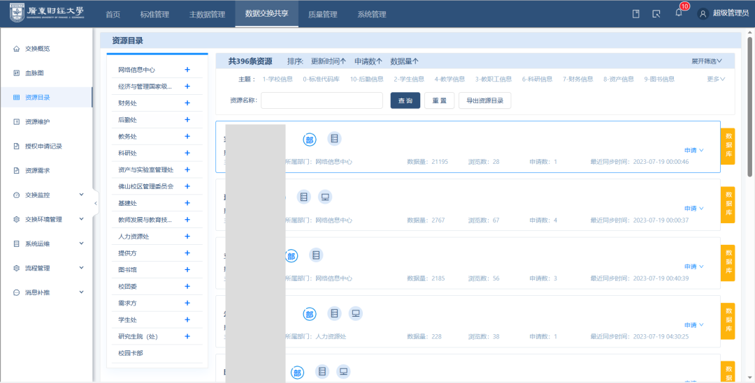 当前,数据服务平台已为广财的科研处、教务处、人力资源处、校团委、资产与实验室管理处等13个业务部门提供了数据共享交换服务,实现数据资源的自助共享,减少业务部门线下跨部门的沟通协调成本,大幅度提高了数据共享的工作效率。