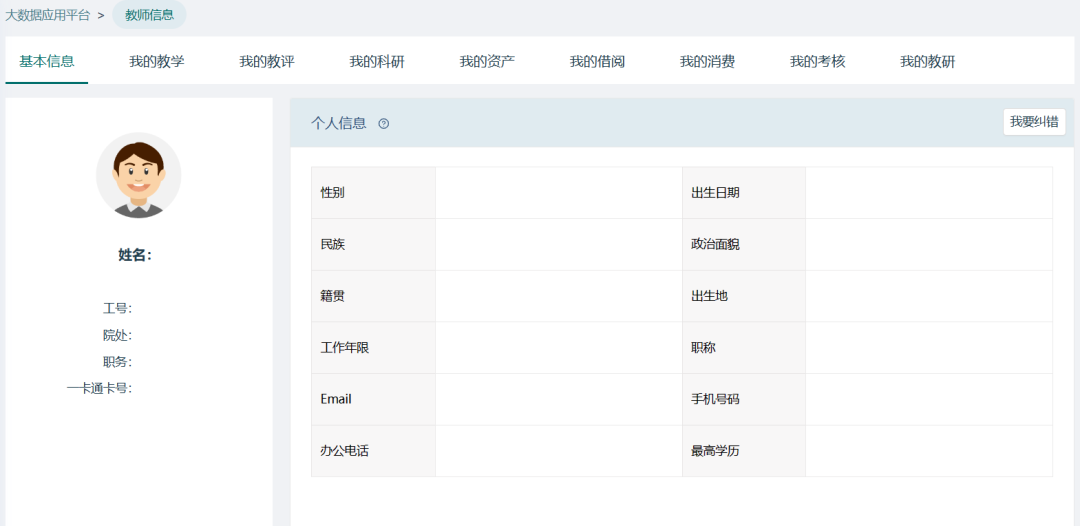 “教师一张表”主要针对全校教职工的在校生活及工作成果进行数据呈现,主要包含教职工的基本信息、教学、教研,科研、消费等方面的数据,综合分析教职工的校园工作生活状态。