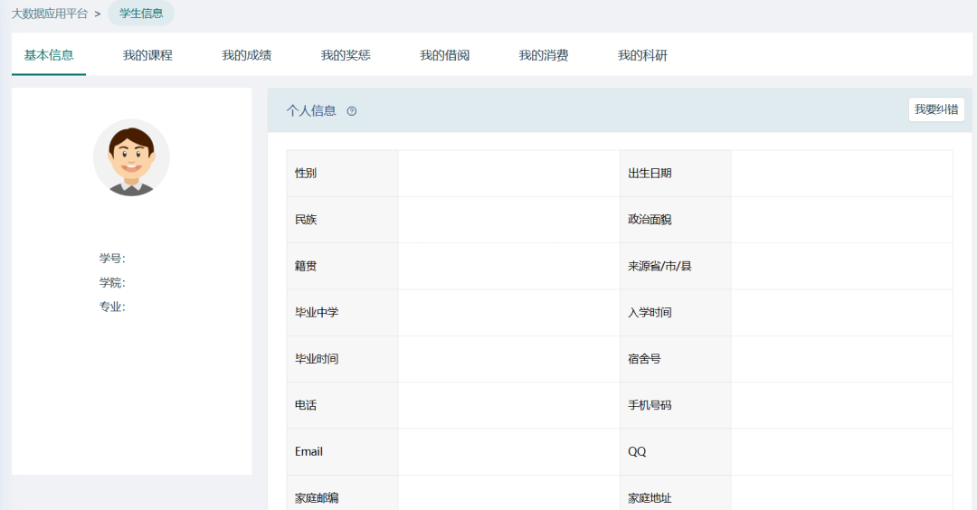 “学生一张表”主要通过数据呈现全校学生的在校生活状态及学习成果,包含学生的基本信息、课程、成绩、奖惩、消费等方面的信息,便于针对性进行学生学习及成长指导。