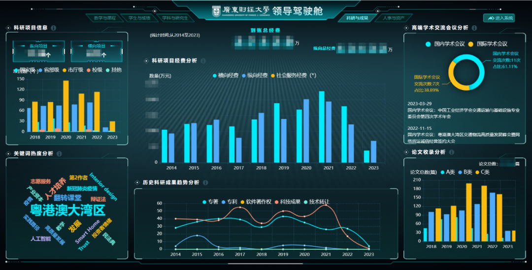 广财的领导驾驶舱系统主要包括教学与课程、学生与成绩、学科与研究生、科研与成果、人事与资产5大核心版块,每个主题紧扣学校关注的核心管理维度进行数据分析,为学校的教学管理和服务提供科学决策指南。