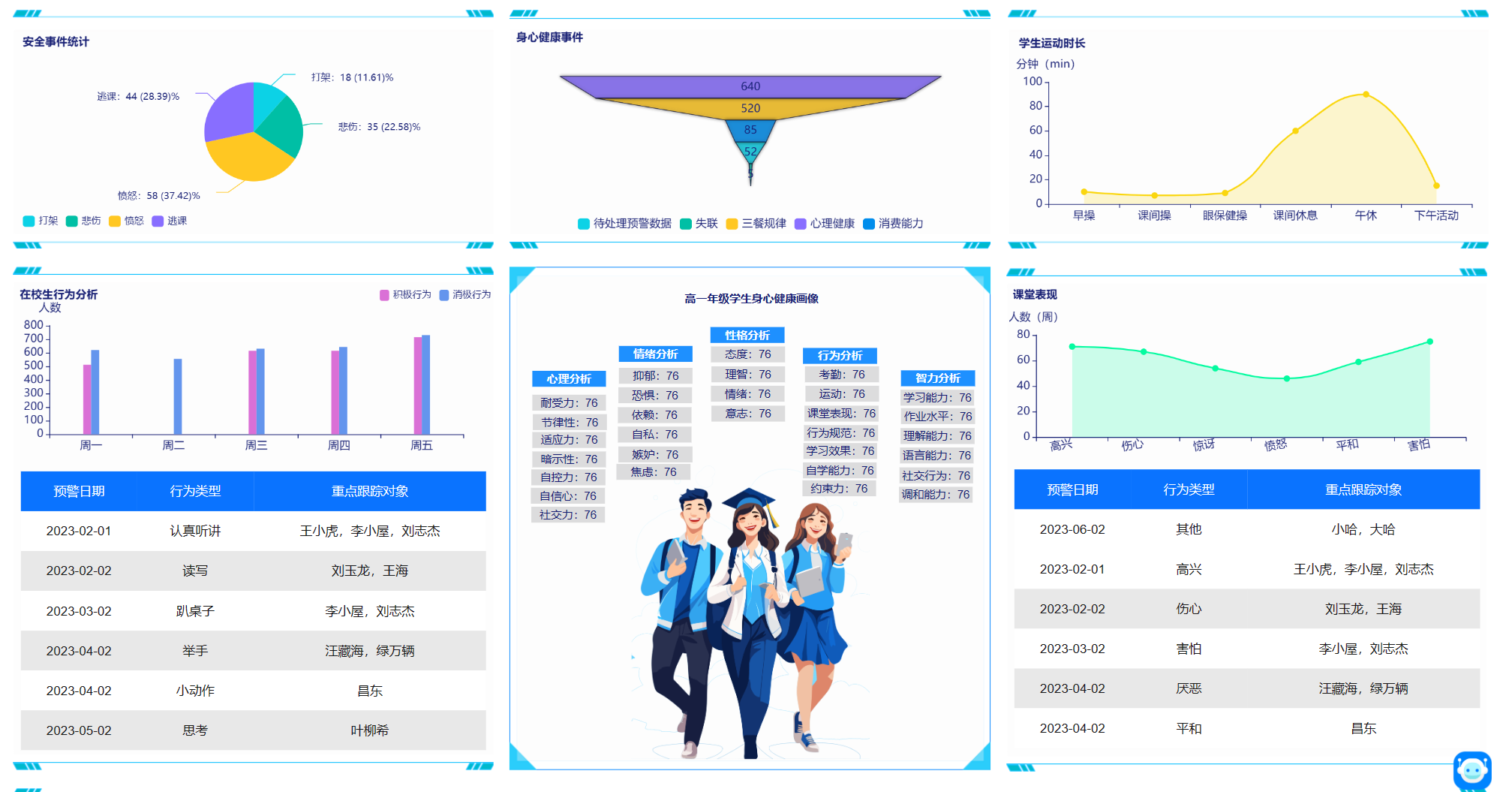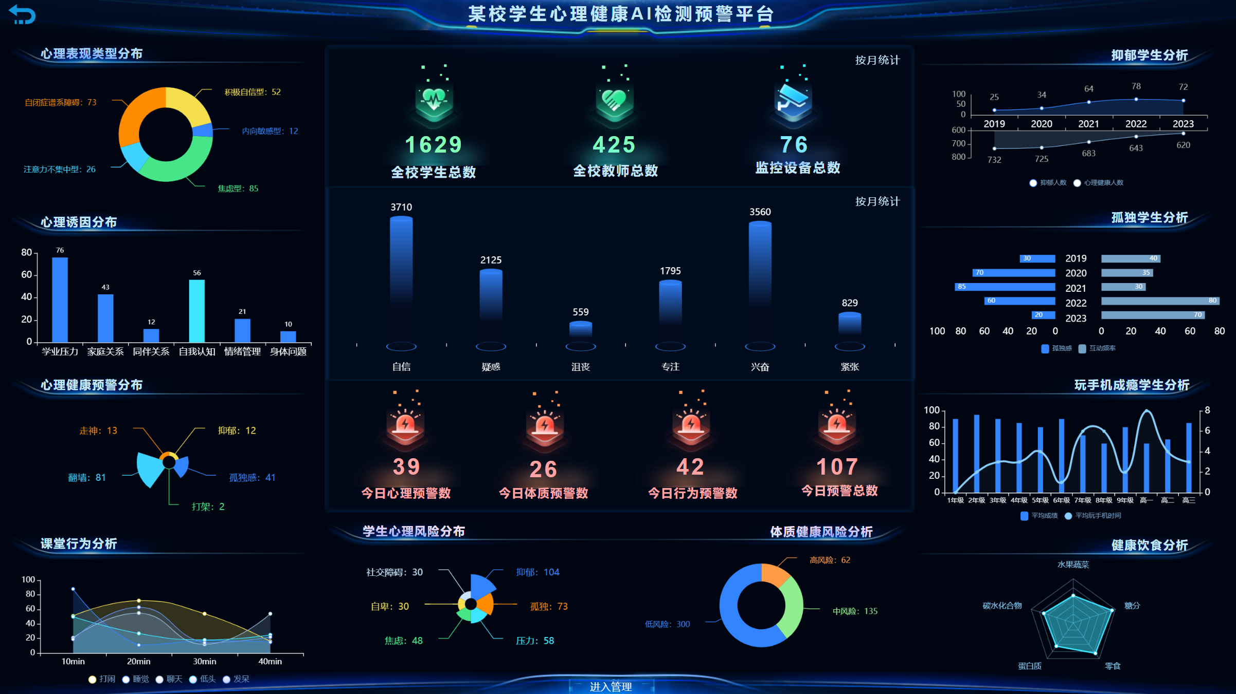 平台提供全周期的学生身心健康智能监测体系,对异常行为或风险事件进行事前预警,包括学生社交关系、学习异常、消费异常、营养异常、情感异常、心理健康、疑似逃课等方面的预警,有利于学校前置干预和解除学生心理危机。