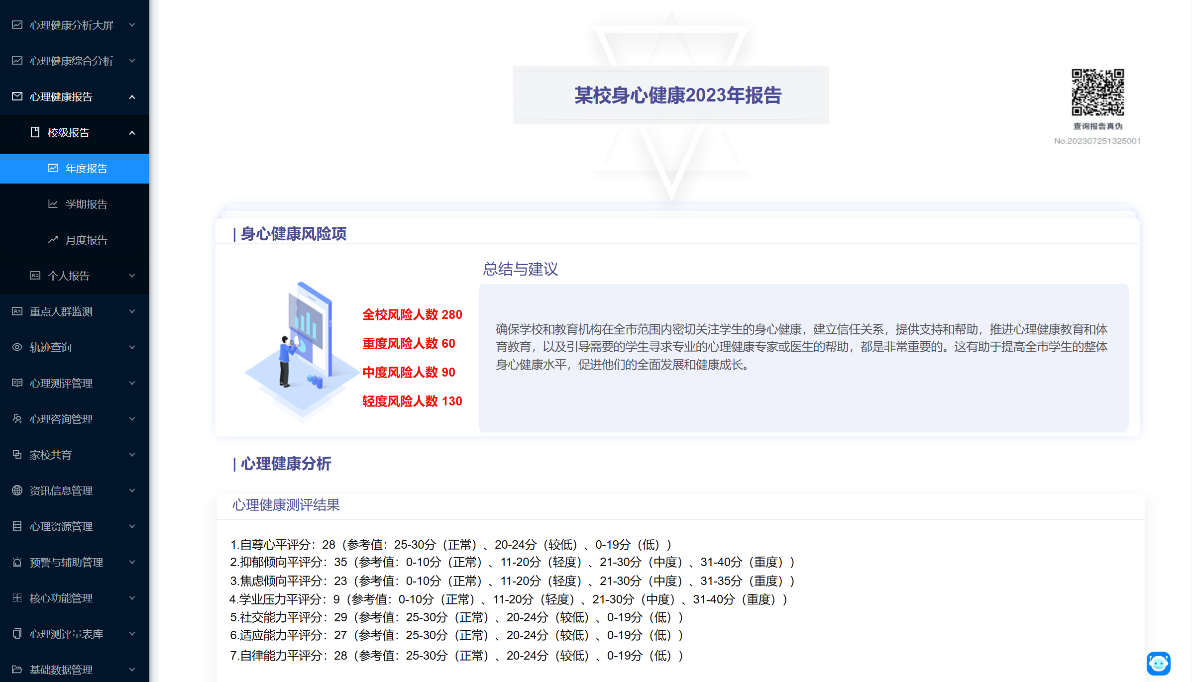 近年来,中小学生心理健康问题日益严峻,受到国家层面的高度重视。教育部等十七部门在《全面加强和改进新时代学生心理健康工作专项行动计划(2023—2025年)》的通知中强调,健全健康教育、监测预警、咨询服务、干预处置“四位一体”的学生心理健康工作体系,完善学校、家庭、社会和相关部门协同联动的学生心理健康工作格局。在此背景下,如何以信息化手段破局,构建完善的学生心理健康监管体系,已成为中小学校的重要命题。