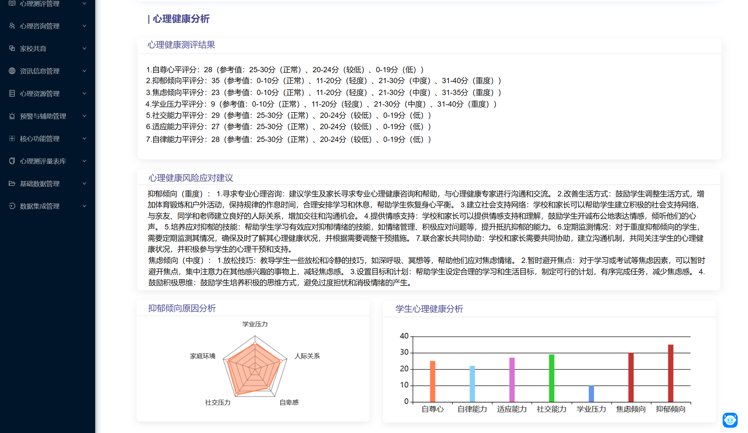 平台根据学生心理健康监测结果,形成“校级、年级、班级、个体”四级心理健康监测报告。通过为教师、家长提供学生心理健康分析报告,引导教师和家长关注学生心理健康,树立科学的培育观念,不断改善教育方式,为学生身心健康成长提供良好保障。通过打造家校协同育人生态圈,为学生营造美好的精神家园。