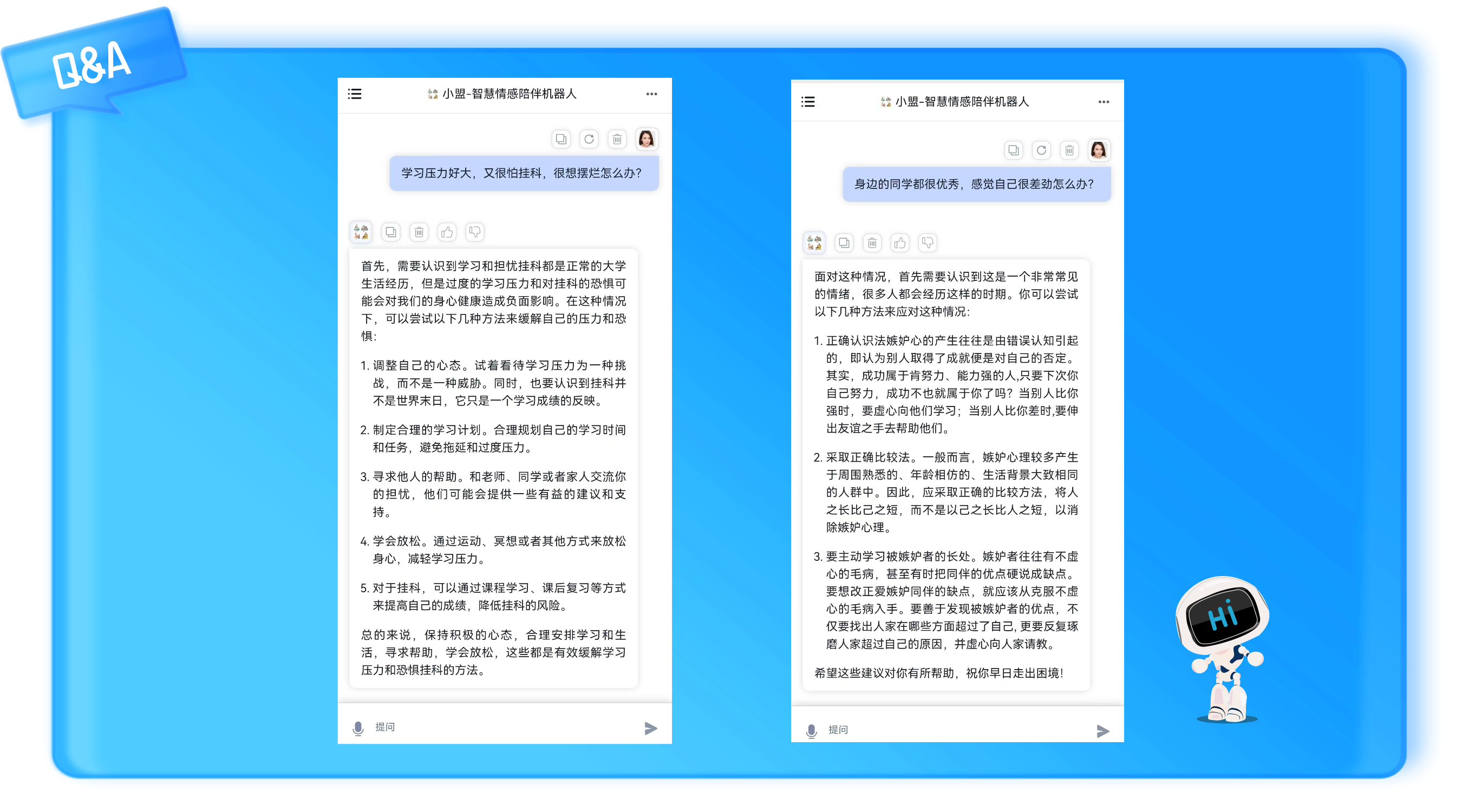 不止于监测和预警,平台还为学生提供了良好的心理辅导渠道。一方面,通过AI情感陪伴机器人,为学生提供日常纾解压力的入口,帮助学生及时缓解不良情绪。