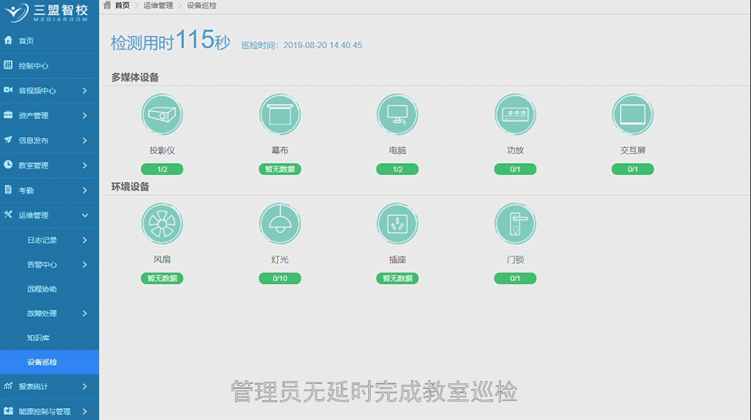 教室多媒体设备数量成倍增加,设备维护也可以变得简单,AIoT智慧教室物联网统一开放平台提供了一套完善的运维管理体系,包括:系统日志、告警中心、远程协助、故障跟踪、知识库、设备巡检、统计分析报表等,真正提高学校日常运维管理效率。