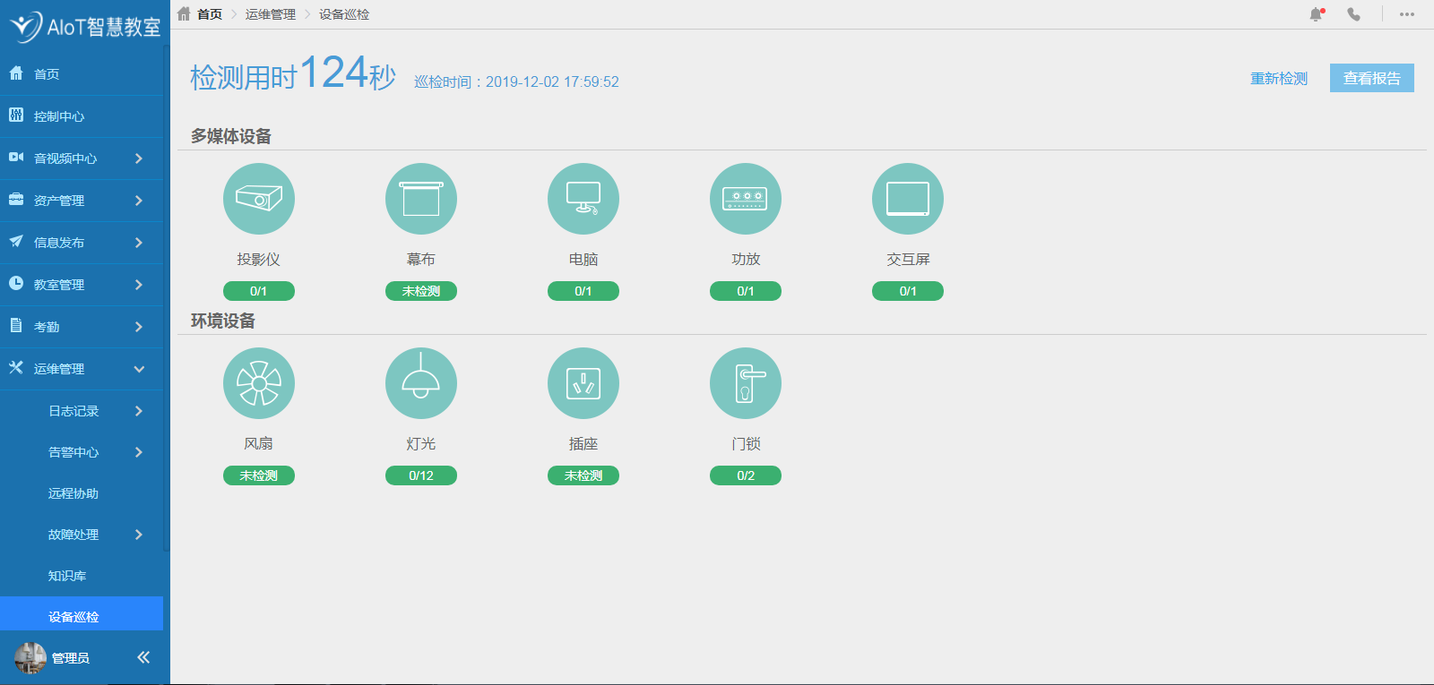 从设备自检—故障告警—故障处理—知识库—数据报表,AIoT智慧教室物联网统一开放平台进行可视化运维管理,随时随地掌控设备运行状况,