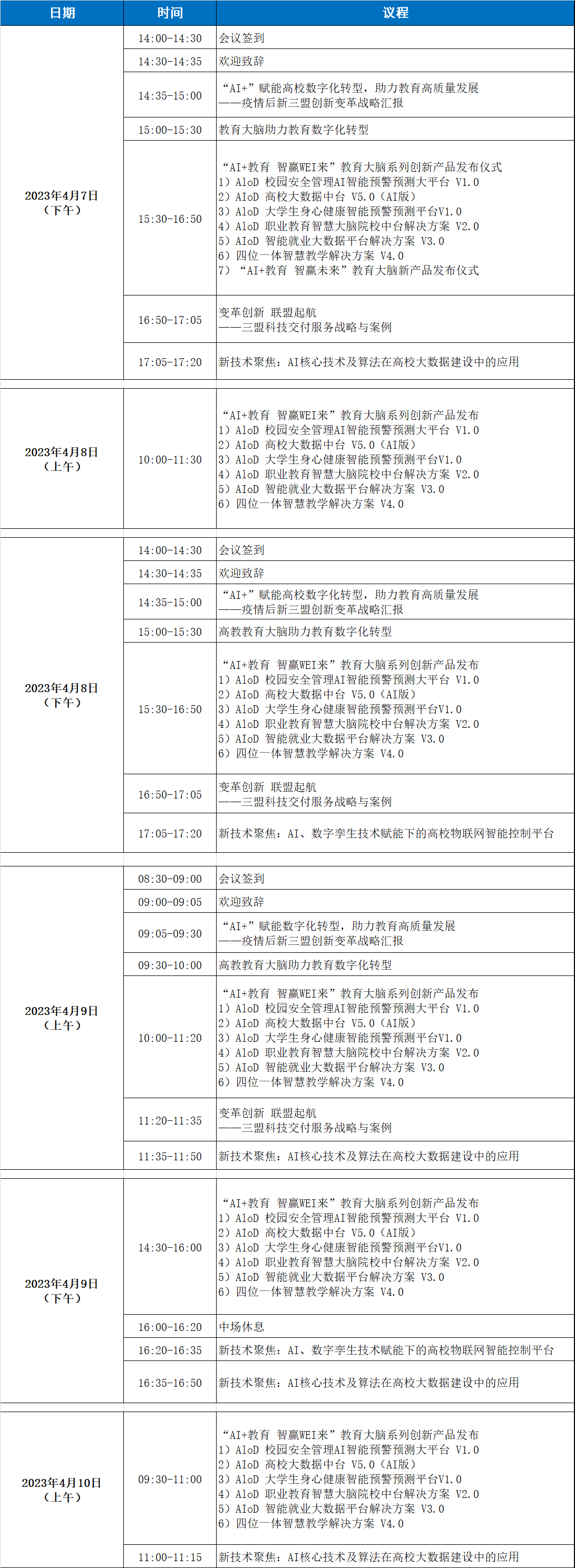 2023年04月07日-10日“AI+”赋能高校数字化转型,助力教育高质量发展——三盟科技首届数智教育大会暨创新产品发布会期间,三盟科技将集中发布一批重磅技术创新及研发成果,与各界专家共同探讨高校教育数字化发展方向与建设路径,助力教育高质量发展。