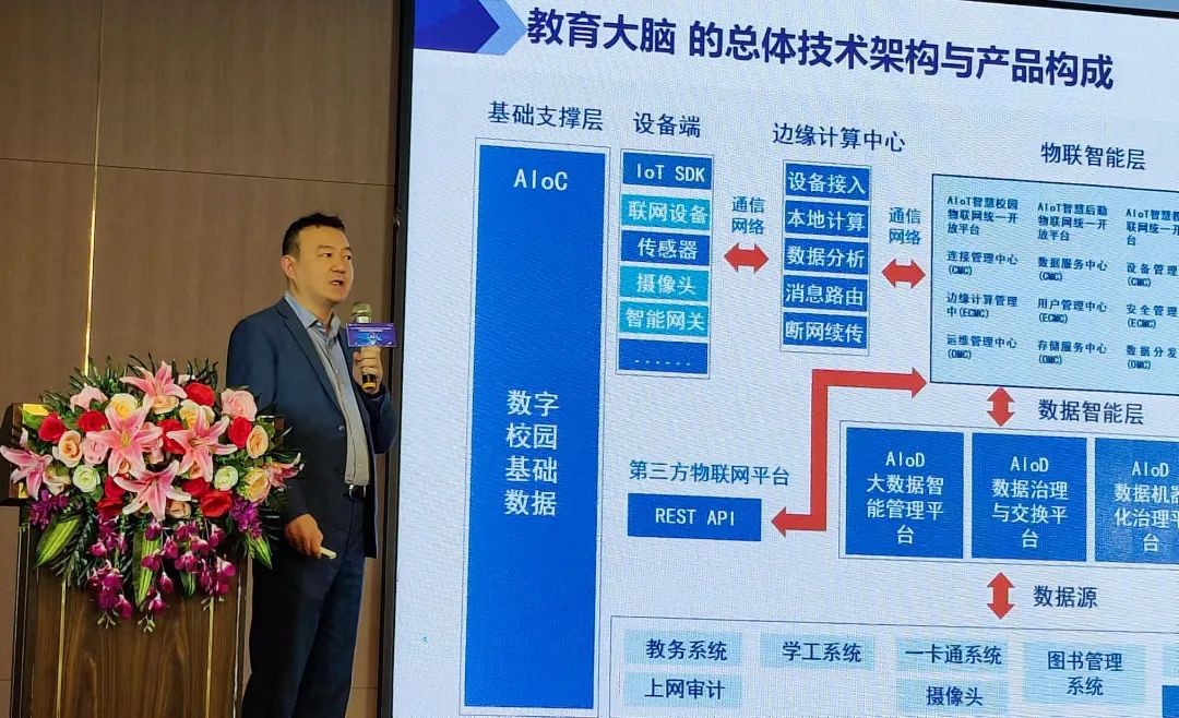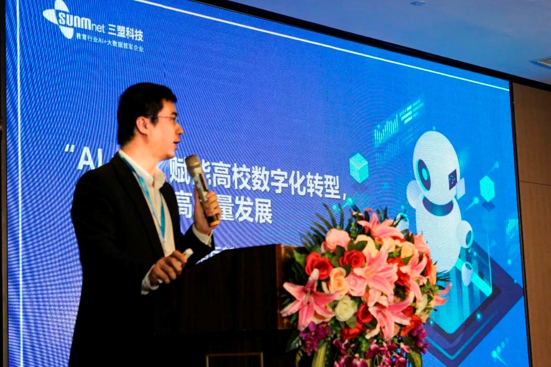 随后,三盟科技副总裁孙国文带来《高教教育大脑助力教育数字化转型》的主题报告。他表示,教育信息化2.0时代,对教育数字化的发展提出了更高要求,注重信息技术与教育教学的深度融合,引领教育深层次变革。三盟科技“教育大脑”打造教育数字基座,利用AI+大数据技术,为各应用场景提供辅助决策,让管理更加科学,让服务更加个性,让教学更加高质量,真正实现高校数字化战略转型。