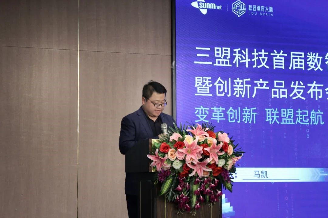 三盟科技副总裁刘昶言带来《疫情后新三盟创新变革战略汇报》的主题报告。他表示,“三盟科技成立十年来,专注人工智能、大数据、物联网等新一代信息技术在教育领域的深度应用,已累计服务全国1000余所院校。当前全领域都在面临数字化转型,尤其是疫情后教育数字化转型的需求空前高涨。疫情三年,三盟科技苦练内功,全面打造企业核心竞争力,从产品迭代优化、商业模式创新、企业运营管理水平、产品战略、市场战略、服务战略,都做了非常大的创新优化和深度变革,为各高校教育数字化转型建设,做好了从产品到解决方案到服务的充分准备。”