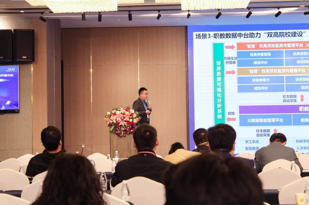 在职业院校中台建设方面,三盟科技职教产品总监吕晓磊分享了AloD 职业教育智慧大脑院校中台解决方案2.0,将有效助力高职院校扫清各种数据治理难题,建成学校公共数据仓库,实现各类基础大数据的共享和交换及可视化的数据分析。