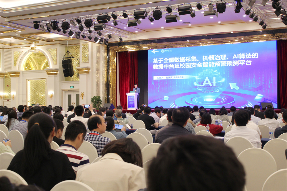 会上,三盟科技高级副总裁孙国文带来《基于全量数据采集、机器治理、AI算法的数据中台及校园安全智能预警预测平台》的主题报告。