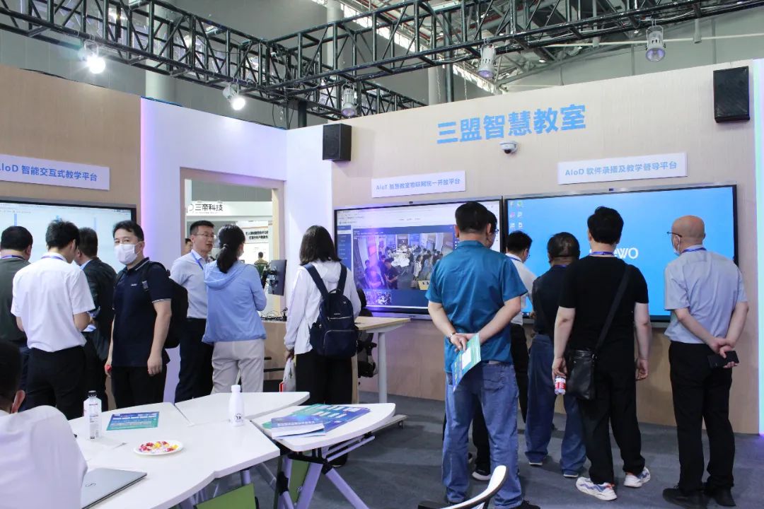 值得一提的是,在智慧教学展区,三盟科技还重磅展示了“六位一体”智慧教学解决方案——AIoT智慧教室物联网统一开放平台、智学堂、AIoD教学资源统一平台、AIoD互动学习平台统一门户、AIoD软件录播及教学督导平台、AIoD教学大数据分析与智能决策平台。针对性解决智慧教学建设过程中存在的难点堵点问题。方案做到贯穿教学空间、课堂教学、智慧资源、督导评价、教学分析等教学全流程,助力高校构建一体化的智慧教学新生态,实现信息共享、数据融通、业务协同、智能服务。