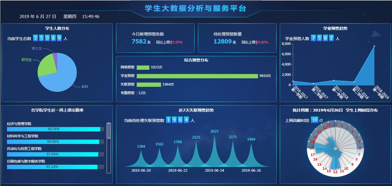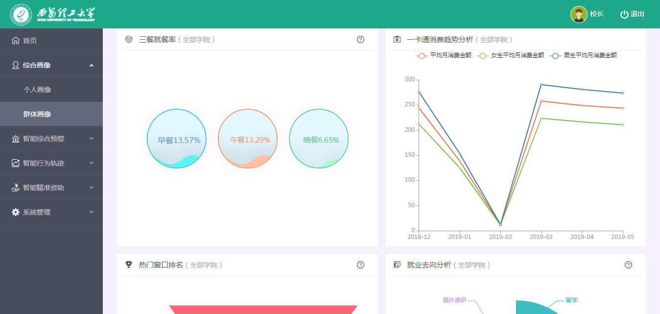 综合画像指根据用户的特征和行为数据建立标签,通过收集与分析学生基础信息、生活习惯、消费行为、学习行为等主要信息的数据之后,完美地抽象出一个学生或一个群体的行为全貌,准确描述用户的特点,支持对用户的精准资料推荐、精准掌握学生情况等活动。