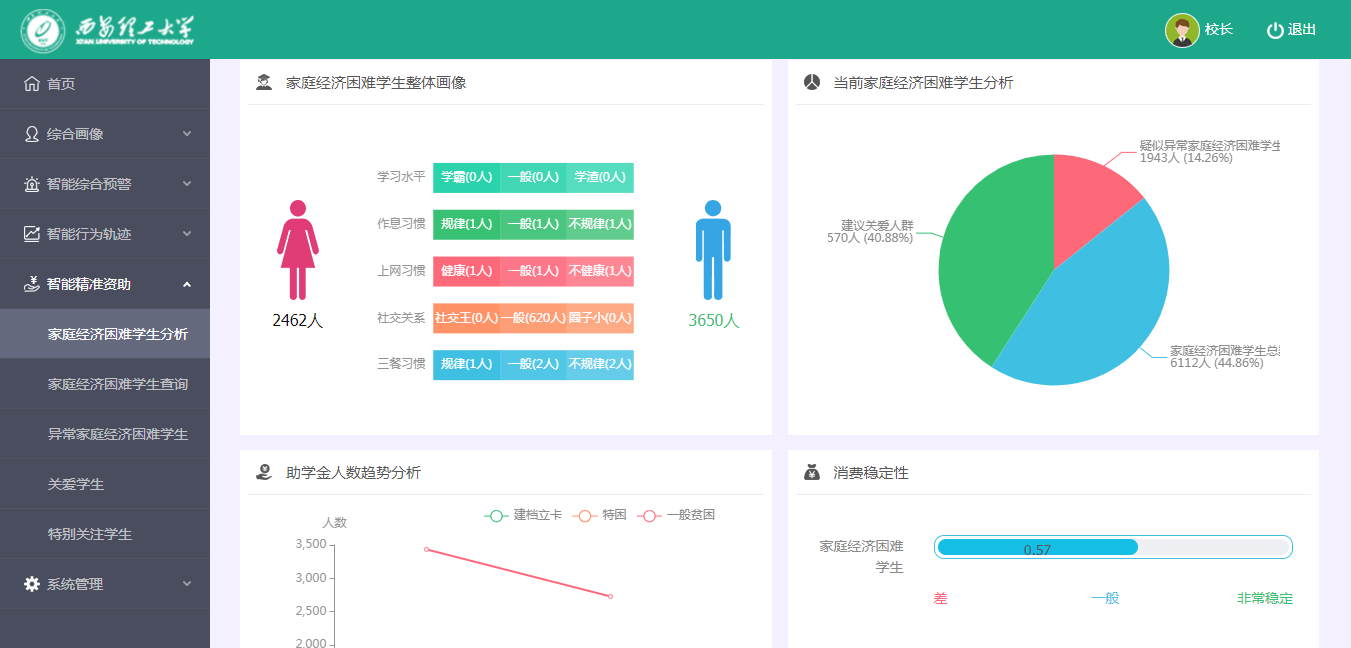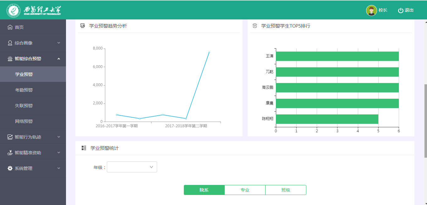 三盟科技学工大数据分析系统有综合画像、综合预警、行为轨迹、精准就业分析、系统管理、思政分析、心理健康分析、精准资助认定八个主要功能模块。这些功能模块包括但不限于学工、心理、团委、宿管、离校、就业及其它功能,是学生管理工作的有效辅助工具,对建立良好学风、维护稳定校园秩序、提升管理服务水平都有着重要作用。