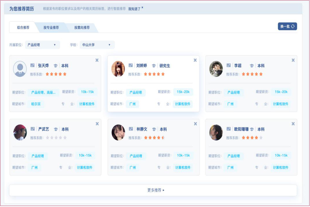 采用大数据+AI的技术,实现人才与岗位的精准双向推荐功能