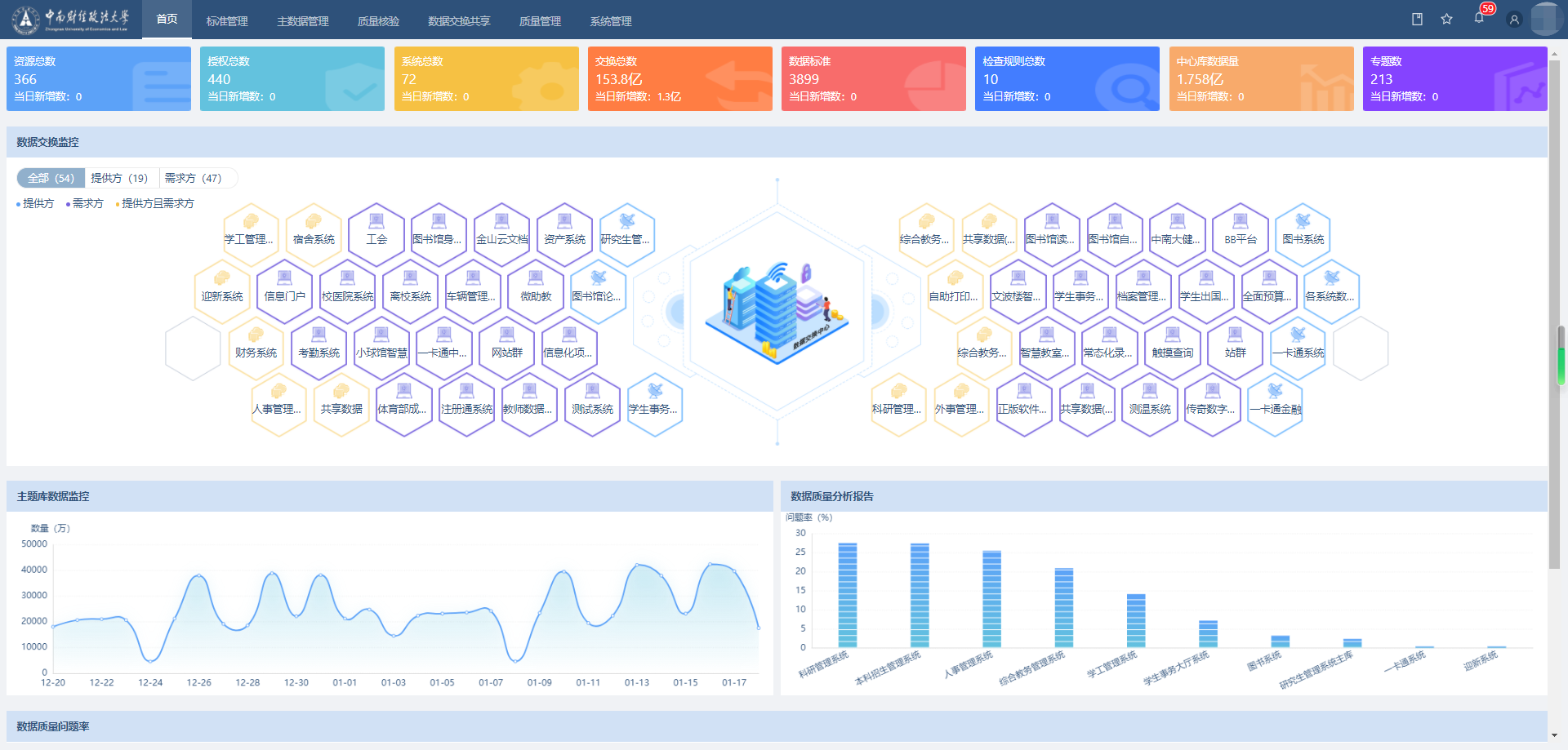 当前,中南大的数据治理已取得了显著进展和成效。自2019年5月开展数据治理至今,学校已建立数据项标准3858个,代码标准143条。平台已对接70个业务系统,创建报表538张,累计开放数据资源366个,完成授权申请427次,累计数据交换总数高达35.9亿条。
