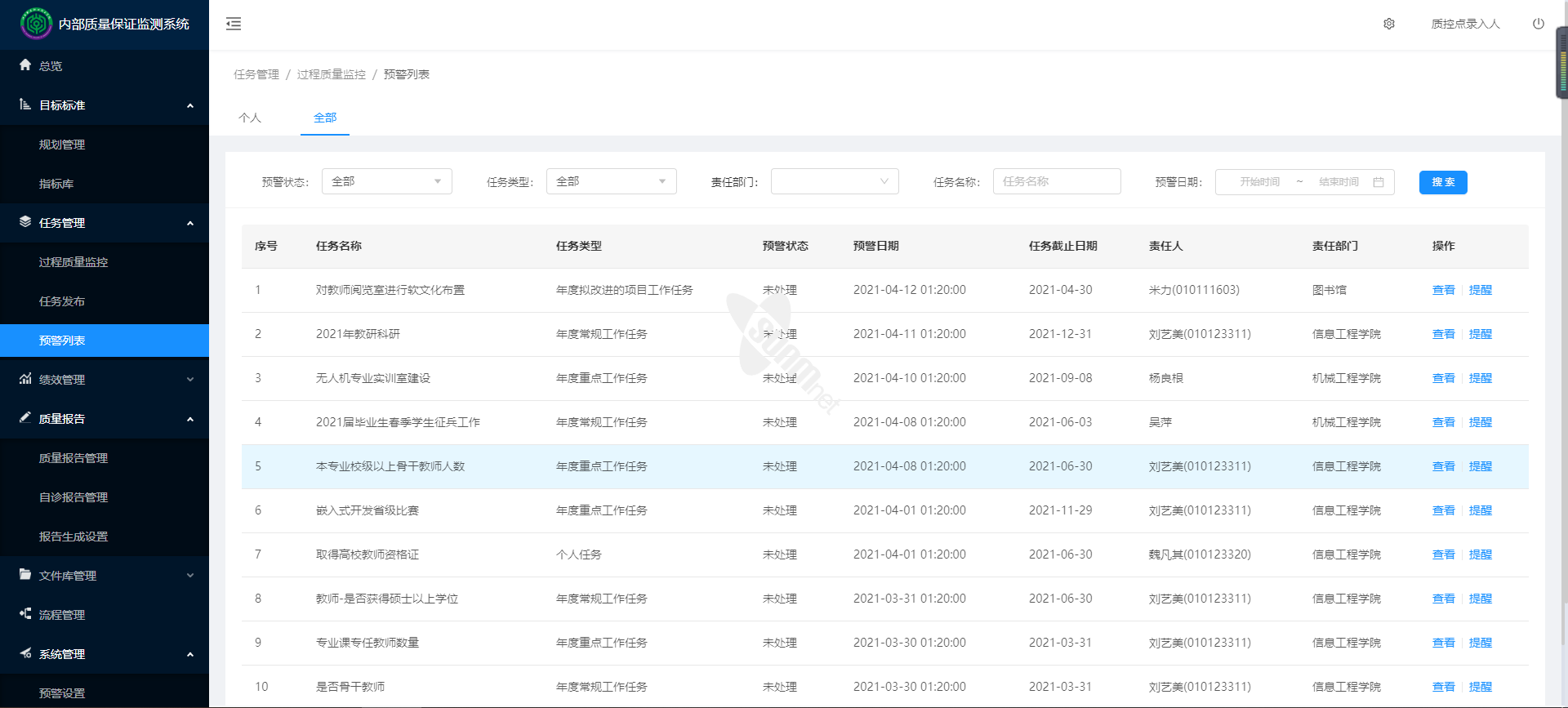 ▲内部质量保证监测系统-预警列表
