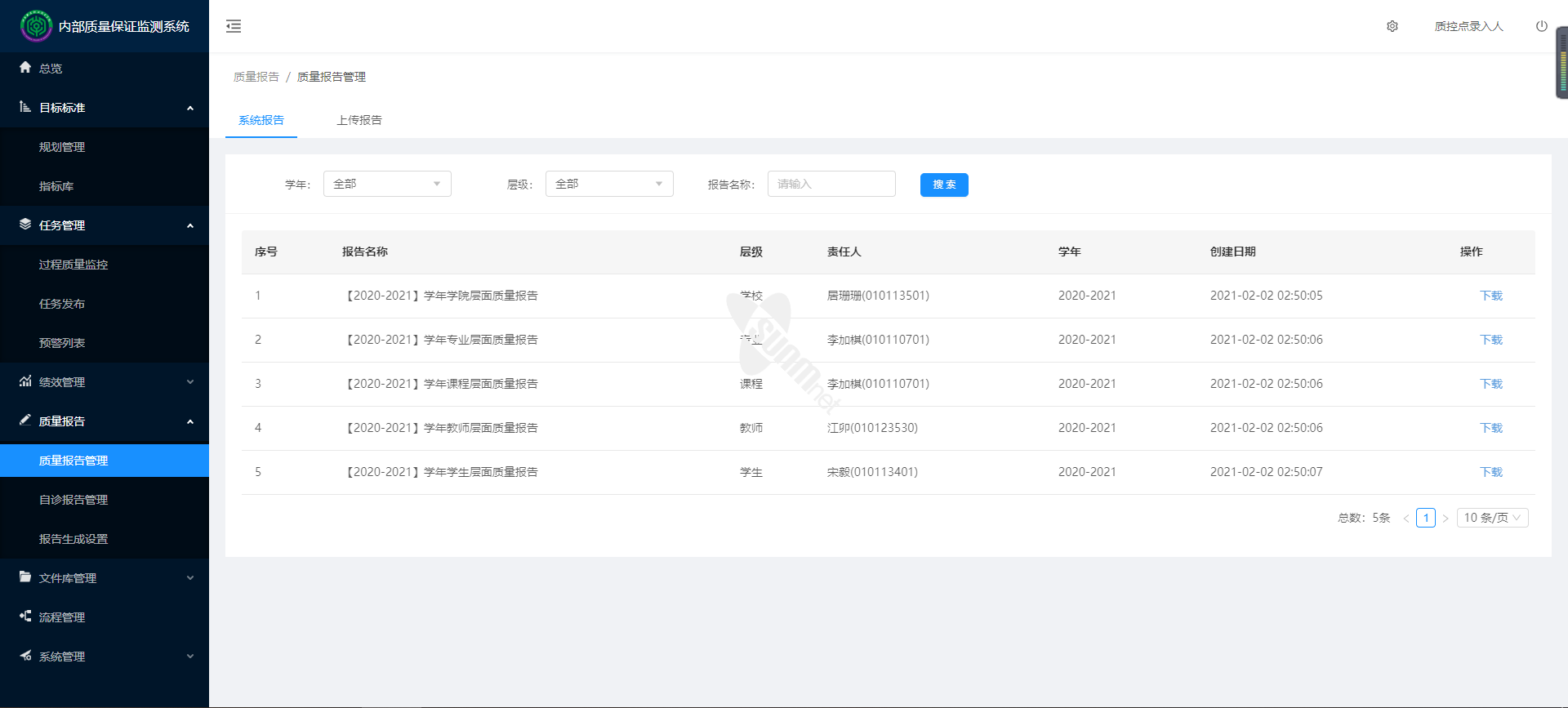 ▲内部质量保证监测系统-质量报告管理