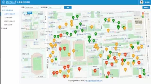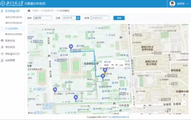 基于校园卡刷卡、网络使用等数据,分析师生校内行为轨迹,结合GIS提供展示和查询服务,并为进一步行为轨迹相关性分析提供基础。