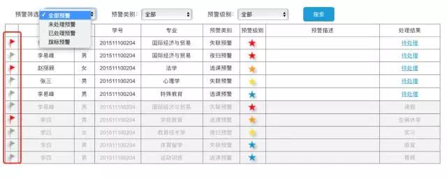 通过对学生校园卡消费刷卡、门禁考勤数据,学生学籍、培养等校务管理信息,以及体育锻炼数据、图书馆借阅数据、校园网络使用数据等综合分析,结合学生画像和行为轨迹分析结果,建立学生各类异常情况判断模型,提供学生异常离校、学业异常、经济、身体健康、行为或心理异常等预警,并为学生相关管理服务部门提供服务。