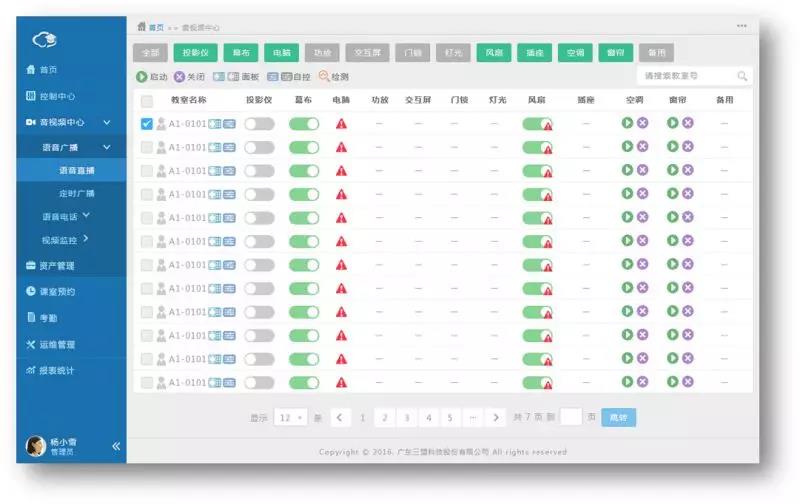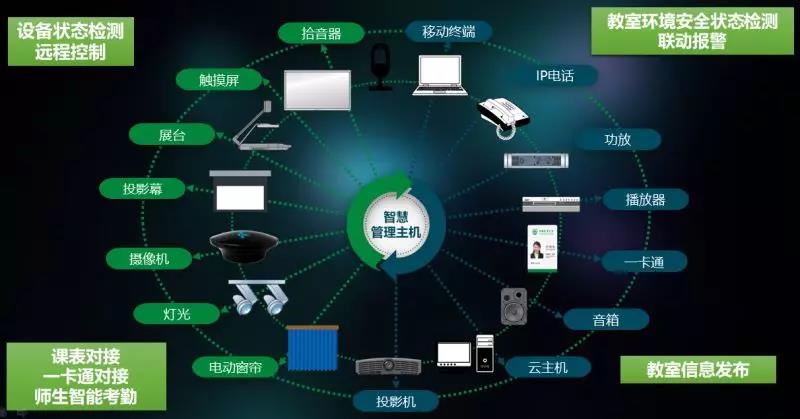 多套系统融合为一,即一套系统融合师生考勤、信息发布、课室借用预约、视频监控、语音广播、语音电话、设备巡检、设备告警等功能