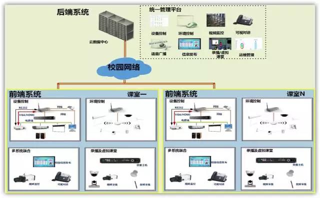 通过多系统融合将原来需要独立建设的如:语音广播、语音对讲、视频监控等系统都通过软件的方式整合到智慧课室管理平台中。